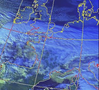Satellitenbild (Falschfarbenbild, Ausschnitt) von NOAA 7 vom 09.01.1982, 14.21 UT.