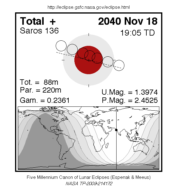LINKSFred Espenak: Total Lunar Eclipse of 2040 Nov 18 HM Nautical Almanac Office: Total Eclipse of the Moon - 2040 November 18 In-The-Sky.org: Total lunar eclipse Ian Cameron Smith: Total Lunar Eclipse of 18 Nov, 2040 AD Timeanddate.de: 18/19. November 2040 — Totale Mondfinsternis |