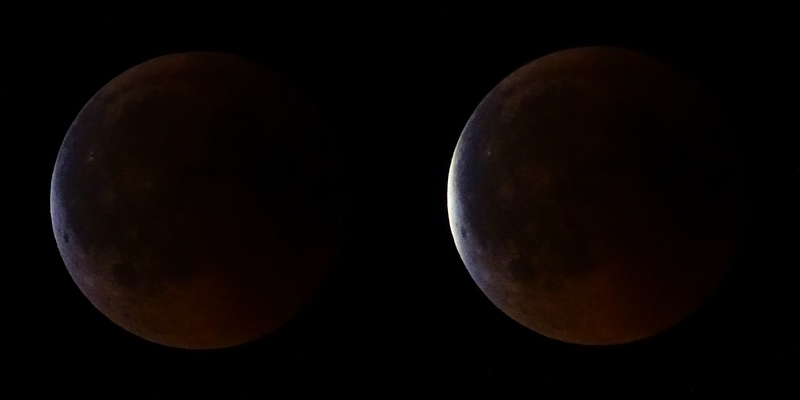 Austritt aus dem Kernschatten bei der Totalen Mondfinsternis am 27.07.2018. Um 23:13 MESZ (links) ist dieser noch nicht erfolgt; 2 Minuten später (rechts) fällt bereits wieder direktes Sonnenlicht auf den Erdtrabanten.
