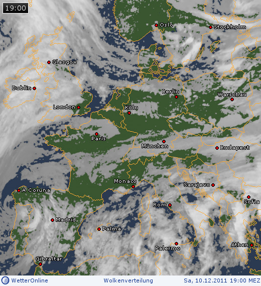 Das Wetter in Mitteleuropa war während der Mondfinsternis am 10.12.2011 durchwachsen. Während der Norden Deutschlands und große Teile des Alpenraums unter einer geschlossenen Wolkendecke lagen, wechselten sich im übrigen Gebiet Wolkenfelder und Aufklarungen ab (s. nachstehende Grafiken). Letztere nahmen zum Ende der MoFi hin deutlich zu. Viele Beobachter, die sich in einem solch begünstigten Bereich aufhielten, hatten allerdings damit zu kämpfen, dass ein am Horizont liegendes weit entferntes Wolkenfeld die Sicht auf den aufgehenden Mond versperrte. In einigen Fällen ließ der Mond sich erst nach Ende der Finsternis sehen; anderswo zeigte er sich aber noch rechtzeitig. Es gibt kaum Fotos und Videos aus Mitteleuropa, wo nicht einige Wolken zu sehen sind, die oftmals die ohnehin malerische Stimmung einer Mondfinsternis in der Dämmerung noch steigerten.